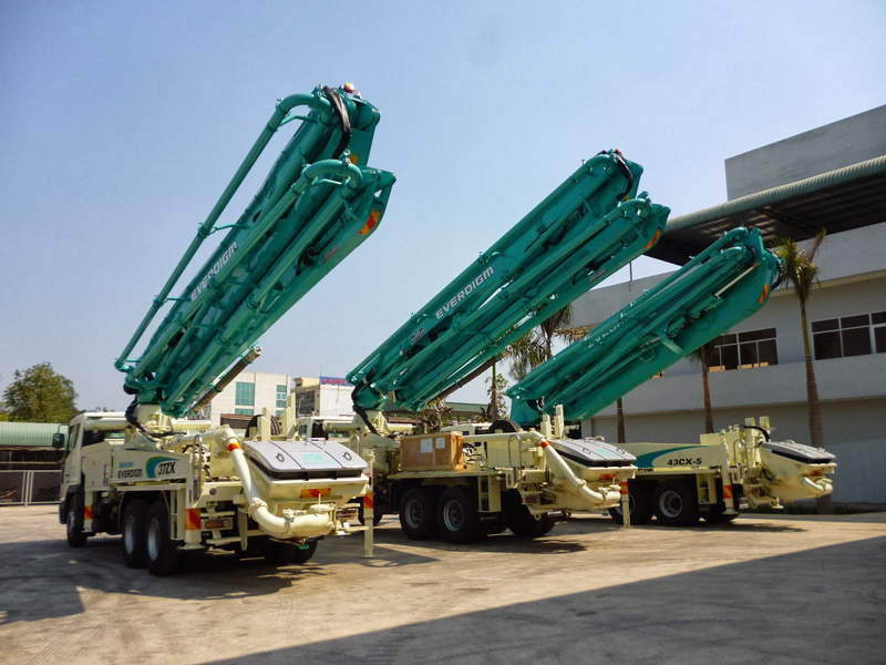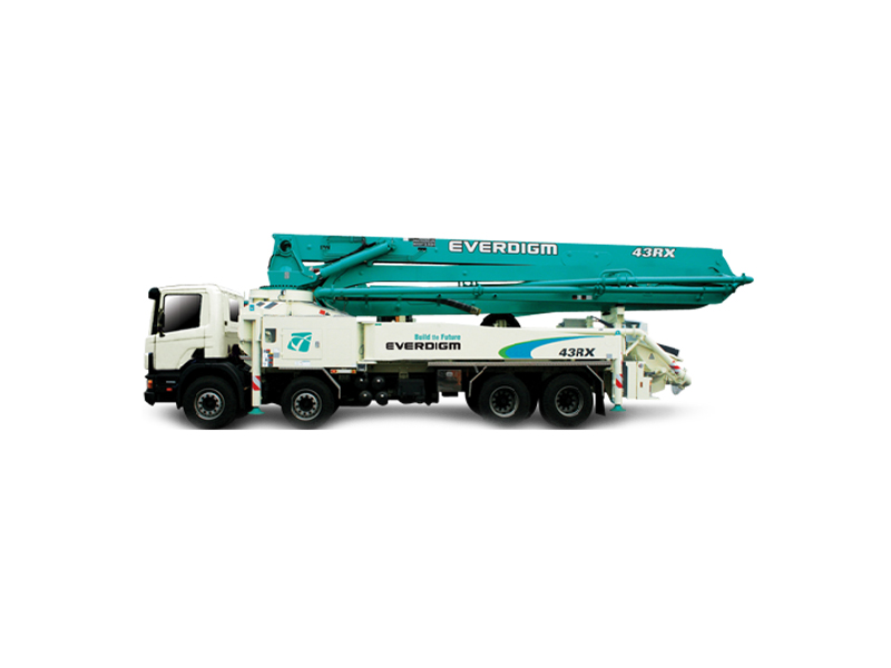 Автобетононасос Everdigm ECP43RX применяются для приема свежеприготовленной бетонной смеси от автомобиля-смесителя и непосредственной подачи к месту укладки. Конструкция данной модели представляет собой рабочее бетононосное устройство, установленное на четырехосном автомобильном шасси. Основным рабочим элементом является насос, который перекачивает смесь по хромированным цилиндрам при помощи однокромочного поршня. Равномерное распределение и бесперебойную подачу бетонной смеси обеспечивает S-образный шибер и пневмонагнетатель. Загрузочный бункер оснащается смесителем, приводимым в действие двумя гидромоторами. Это позволяет сохранить подвижность бетона и эффективно подавать ее к цилиндрам. Бетононасос снабжен 5-секционной раскладной стрелой. Применение этой машины позволит оптимизировать работу, а укладка больших объемов бетона будет произведена быстро и качественно.