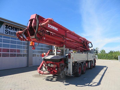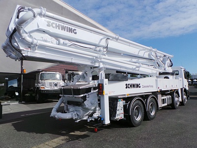 Автобетононасос Schwing с максимальной возможной высотой подачи бетона 41,8 м и дальностью подачи 38,1 м обладает четырехсекционной телескопической стрелой. Большая производительность насоса делает его одним из самых эффективных в своем классе. Это компактная и маневренная машина, которая имеет расширенный функционал: не только доставляет бетон, но и укладывает его. По сути она замещает собой бетономешалку, насос и раздаточную стрелу. Техника сконструирована универсальной, поэтому может транспортировать и укладывать абсолютно любые смеси и растворы. Надежные шасси. Бетономешалка и стрела монтируются на четырехосные шасси таких известных производителей, как Mercedes, Volvo, MAN, Scania.