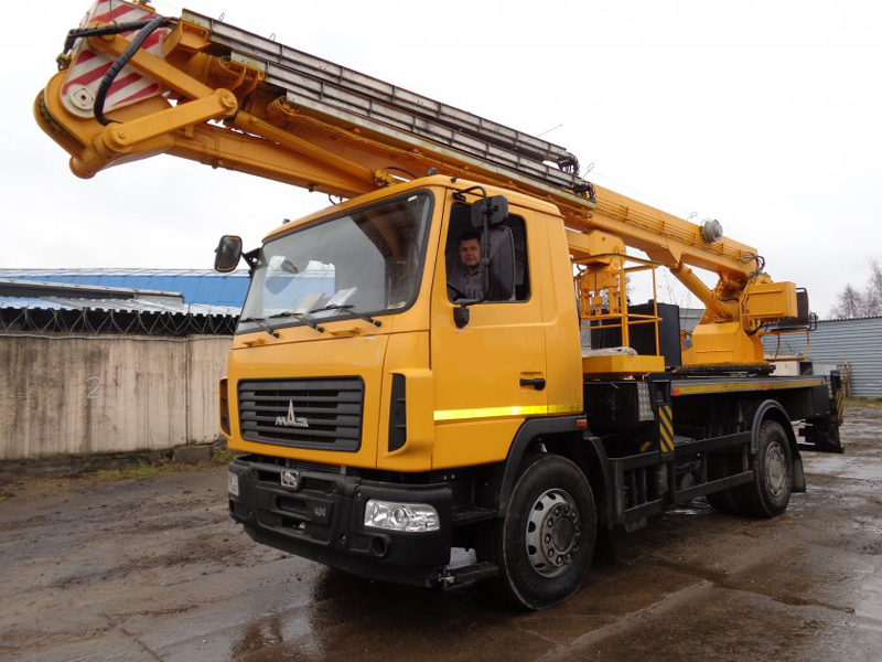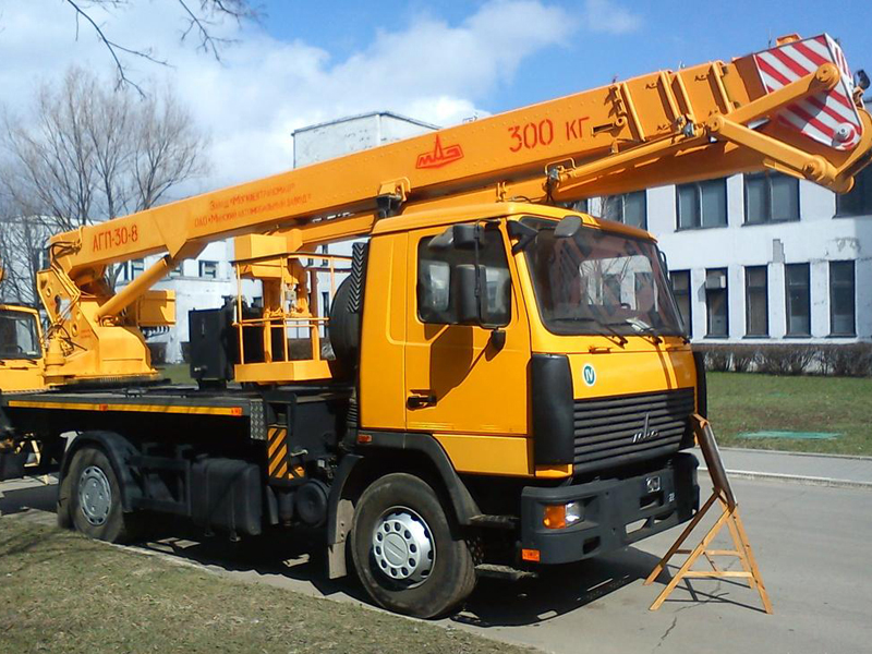 Автовышка АГП 30 на базе МАЗ 5340 30 метров имеет грузоподъемность 300 кг м предназначен для проведения строительно-монтажных, ремонтно-декоративных работ на высоте, а также для обслуживания линий электропередач напряжением до 1000 В. Стреловое оборудование комбинированного типа - трёхсекционная телескопическая стрела, а также наличие поворотной секции, обеспечивает подъёмнику обширную рабочую зону. Подъемник оборудован двумя пультами управления стреловым оборудованием и поворотной платформой. Управление выносными опорами осуществляется с пульта, расположенного на раме шасси.
