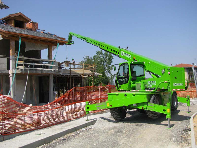 Главная особенность серии Roto, это возможность работать на 360°, благодаря вращающейся башне, которая обеспечивает больший радиус действия по сравнению с неподвижным телескопическим погрузчиком. Серия Roto от Merlo Group стала синонимом категории телескопических погрузчиков с поворотной башней по всему миру. Модель ROTO R40.26MCSS имеет двухступенчатую гидроуправляемую трансмиссию с реверсированием на ходу. Рулевое управление осуществляется передними колесами, колея в колею, есть крабовый ход. Имеется постоянно включенный полный привод. Сухая дисковая независимая на каждое колесо тормозная система. Кабина соответствует стандарту FOPS 2-го уроня. Активная система безопасности - динамический контроль опасности опрокидывания со световой и звуковой сигнализацией и блокировкой опасных движений.
