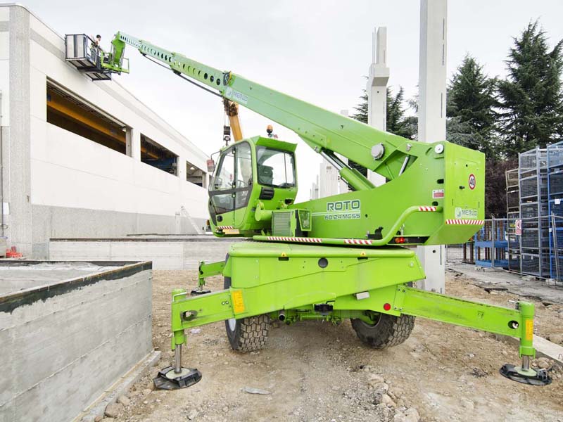 Главная особенность серии Roto, это возможность работать на 360°, благодаря вращающейся башне, которая обеспечивает больший радиус действия по сравнению с неподвижным телескопическим погрузчиком. Серия Roto от Merlo Group стала синонимом категории телескопических погрузчиков с поворотной башней по всему миру. Модель ROTO R60.24MCSS имеет двухступенчатую гидроуправляемую трансмиссию с реверсированием на ходу. Рулевое управление осуществляется передними колесами, колея в колею, есть крабовый ход. Имеется постоянно включенный полный привод. Сухая дисковая независимая на каждое колесо тормозная система. Кабина соответствует стандарту FOPS 2-го уроня. Активная система безопасности - динамический контроль опасности опрокидывания со световой и звуковой сигнализацией и блокировкой опасных движений.