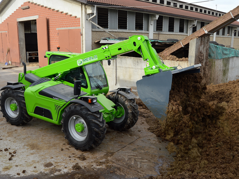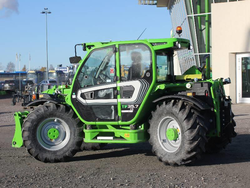 Merlo первым создал телескопический погрузчик, предназначенный для сельского хозяйства, оснащенный сертификацией для буксировки прицепов на дороге со скоростью 40 км/ч. Модели Turbofarmer - идеальное решение для удовлетворения потребностей в сельскохозяйственном мире. Модель TURBOFARMER TF35.7 имеет двухступенчатую гидроуправляемую трансмиссию с реверсированием на ходу. Рулевое управление осуществляется передними колесами, колея в колею, есть крабовый ход. Имеется постоянно включенный полный привод. Сухая дисковая независимая на каждое колесо тормозная система. Кабина соответствует стандарту FOPS 2-го уроня. Активная система безопасности - динамический контроль опасности опрокидывания со световой и звуковой сигнализацией и блокировкой опасных движений.
