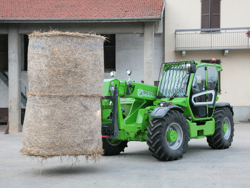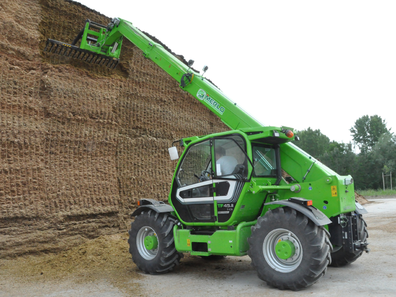 Merlo первым создал телескопический погрузчик, предназначенный для сельского хозяйства, оснащенный сертификацией для буксировки прицепов на дороге со скоростью 40 км/ч. Модели Turbofarmer - идеальное решение для удовлетворения потребностей в сельскохозяйственном мире. Модель TURBOFARMER TF45.11T имеет двухступенчатую гидроуправляемую трансмиссию с реверсированием на ходу. Рулевое управление осуществляется передними колесами, колея в колею, есть крабовый ход. Имеется постоянно включенный полный привод. Сухая дисковая независимая на каждое колесо тормозная система. Кабина соответствует стандарту FOPS 2-го уроня. Активная система безопасности - динамический контроль опасности опрокидывания со световой и звуковой сигнализацией и блокировкой опасных движений.