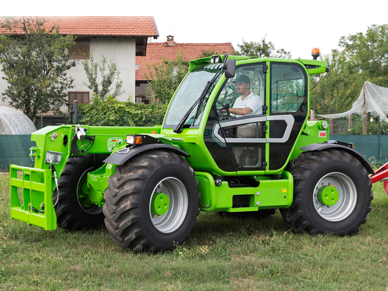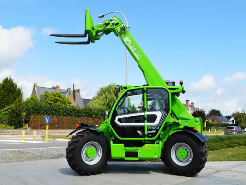 Merlo первым создал телескопический погрузчик, предназначенный для сельского хозяйства, оснащенный сертификацией для буксировки прицепов на дороге со скоростью 40 км/ч. Модели Turbofarmer - идеальное решение для удовлетворения потребностей в сельскохозяйственном мире. Модель TURBOFARMER TF50.8T имеет двухступенчатую гидроуправляемую трансмиссию с реверсированием на ходу. Рулевое управление осуществляется передними колесами, колея в колею, есть крабовый ход. Имеется постоянно включенный полный привод. Сухая дисковая независимая на каждое колесо тормозная система. Кабина соответствует стандарту FOPS 2-го уроня. Активная система безопасности - динамический контроль опасности опрокидывания со световой и звуковой сигнализацией и блокировкой опасных движений.
